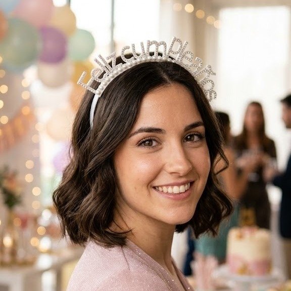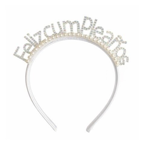 Vincha plástica "Feliz Cumpleaños" con strass y perlitas blanca