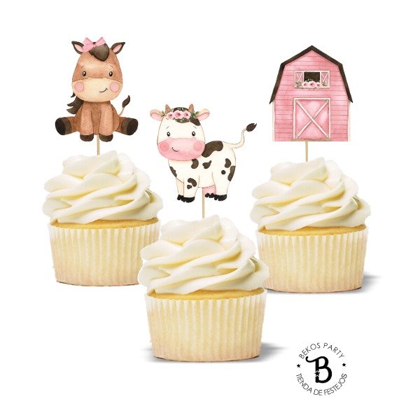 Topper cupcake silueta x 6 Granja Acuarela rosa